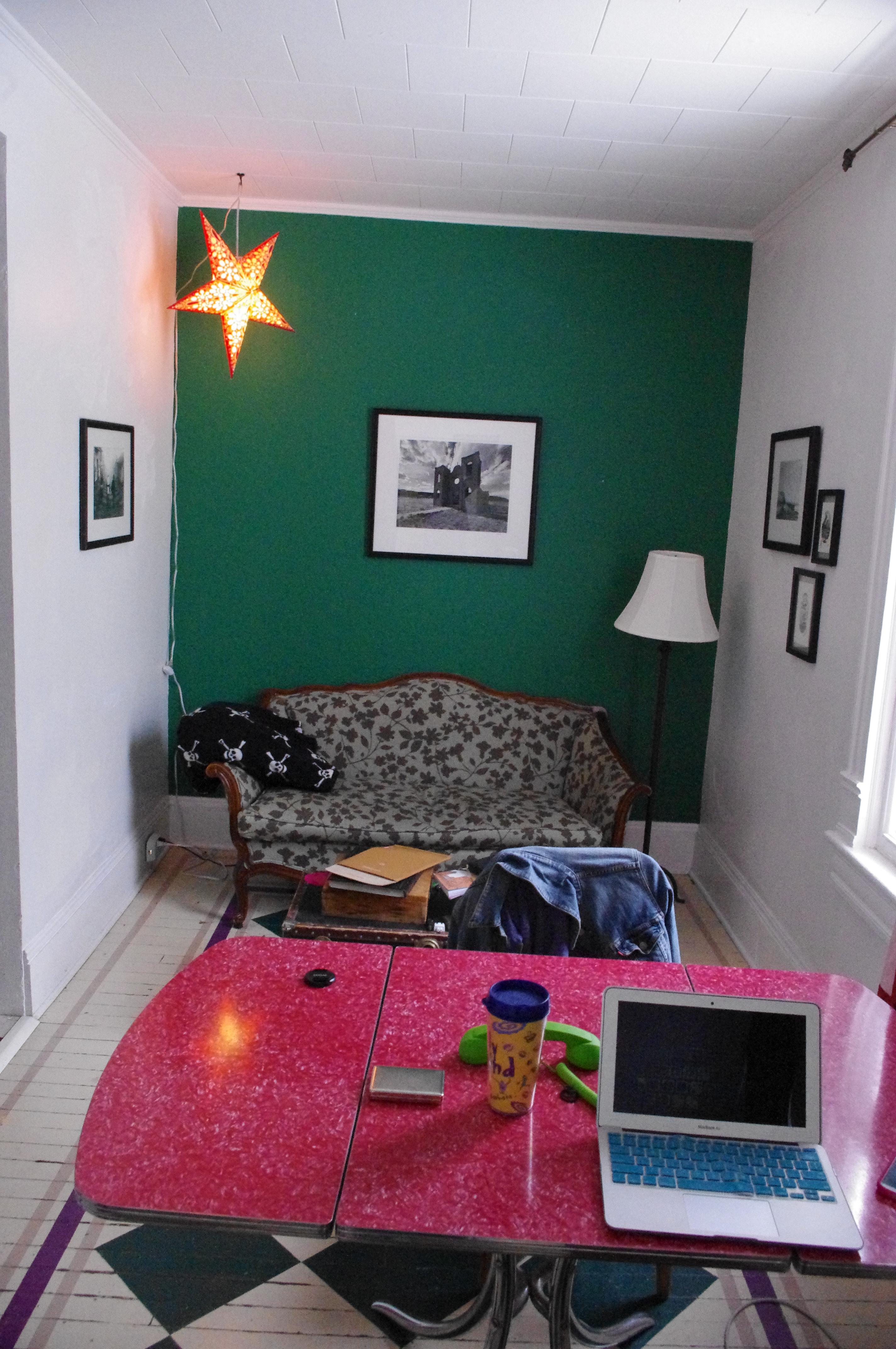 Vintage 50s table? Check. Classy heirloom love-seat? Check. Fine desert photography from my native land? Check. Green accent wall? Obviously.